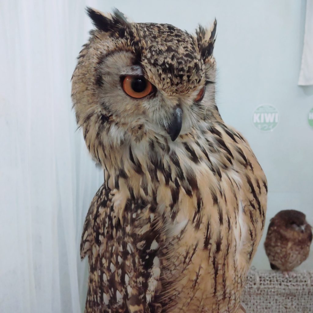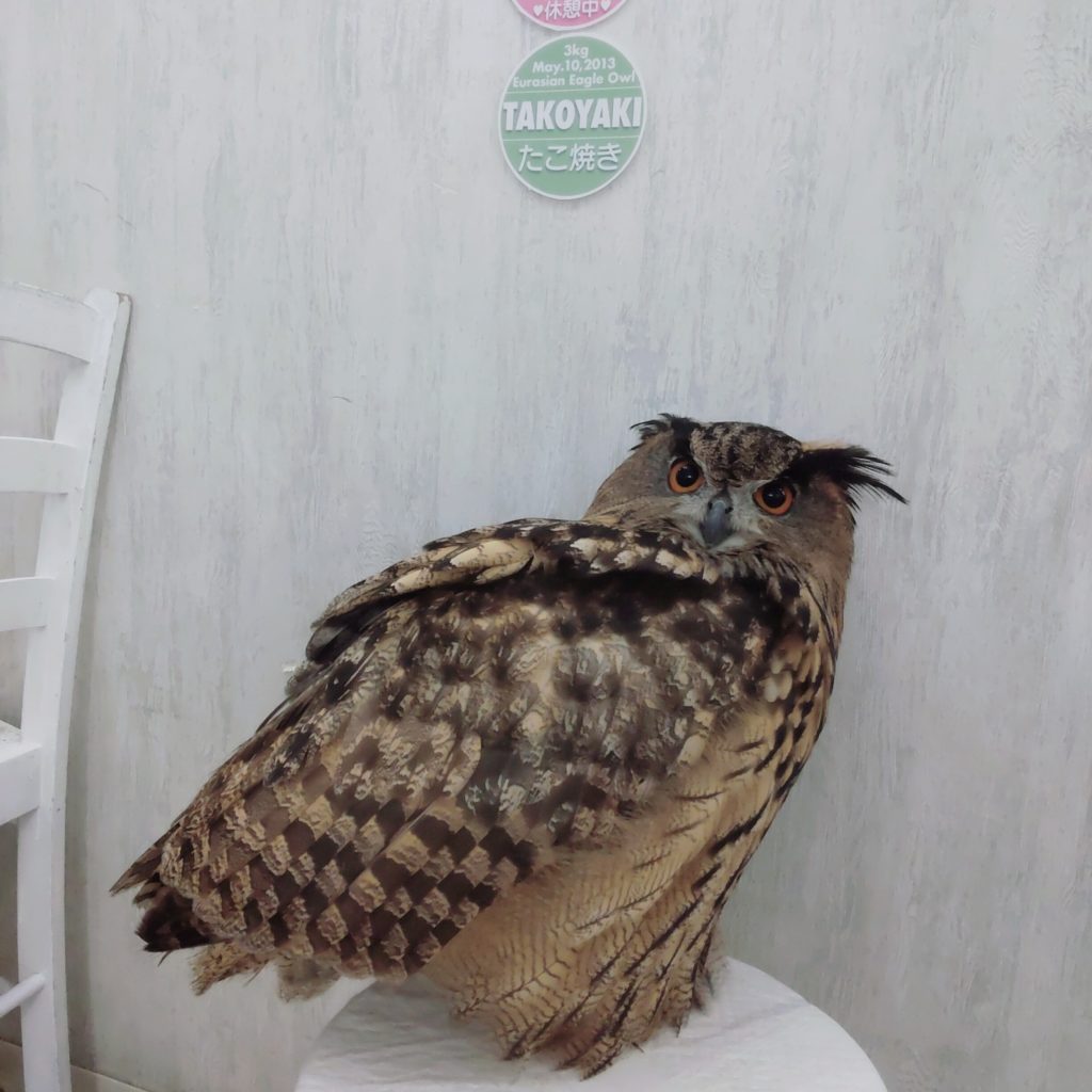 ヨーロピアンワシミミズクのたこ焼き君なんですが…マジで…「この中で一番デカい」と一目でわかるでかさでした。もうなんか貫禄がヤバイ。多分この子くらいが60cmとか65cm↑級で、フクロウのitsrnさんもこんくらいなんだと考えると本当にやばいです。「食物連鎖の上位種族」感がめちゃくちゃあります。このサイズのフクロウに懐かれてたら「な、何者だあいつ…」って強者感出ちゃうと思います。っていうかこのサイズ膝に乗せられるんか!?視界が全部フクロウにならんか!?