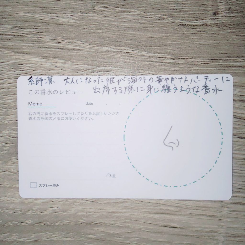 実は3つの内1つだけ、「大人になったitsrnさんがパーティーで身に纏うような香りをお願いします」という無茶振りをお願いしています(セレスさんを困らせるな!!)。