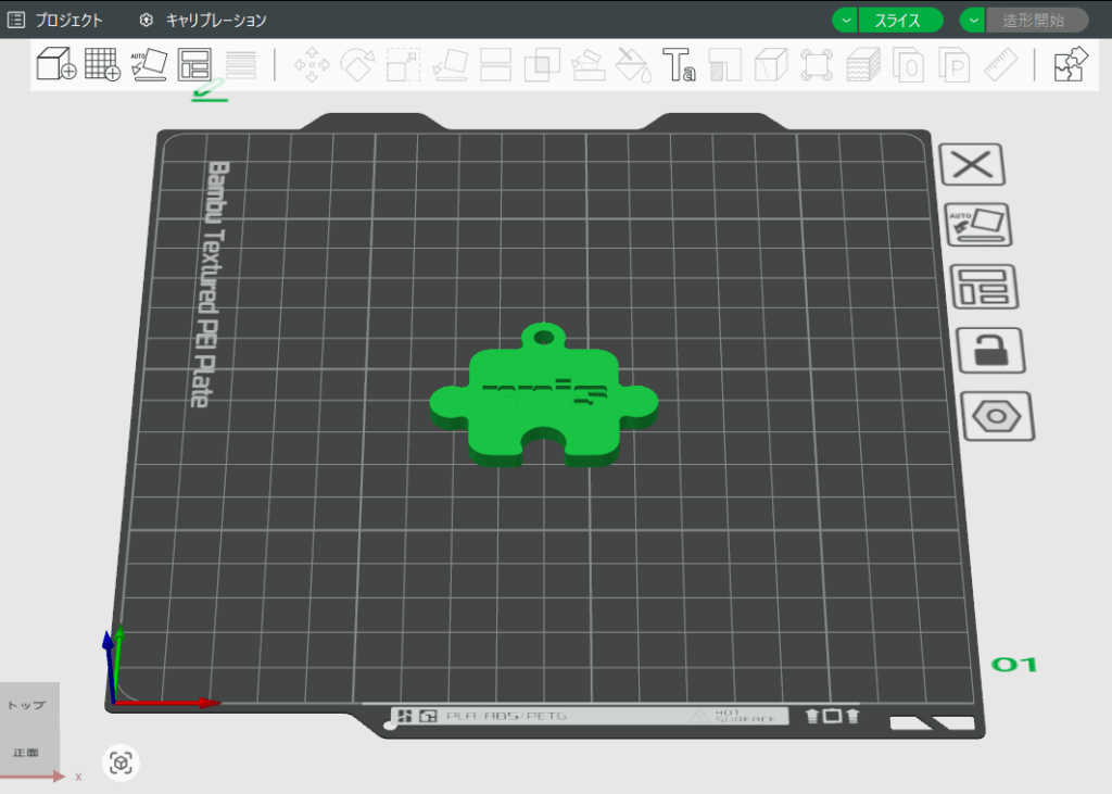 STLのファイルを作ってからスライサーソフトで保存したSTLファイルを読み込むと、そこにこれからプリントするデータが出てきます。ここで「スライス」という「どう3Dプリントするのか?」を決めてもらい(自動でやってくれます)、もう3Dプリントを実行できます。